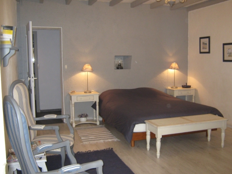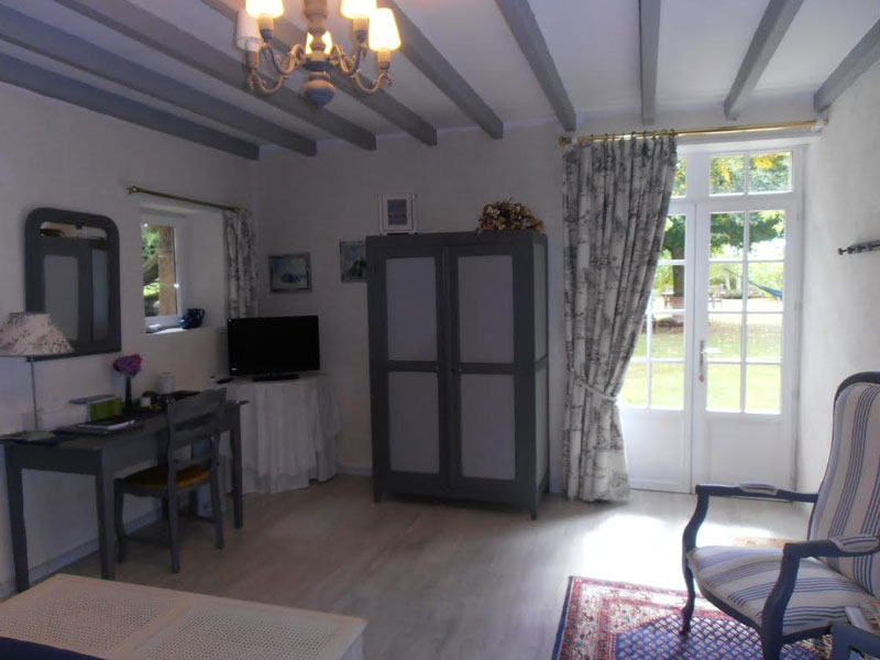 Questo bellissimo b & b in camera di 20m2 con il comfort e decorazione raffinata, con mobili antichi e oggetti antichi, è come il cielo in Bretagna: nei toni del blu e grigio.